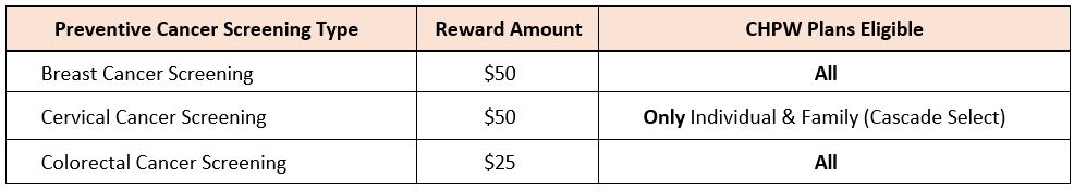 Rewards are only available to current CHPW Members. They must meet the age requirements by screening type and be a CHPW member with the eligible plan at the time of the screening.